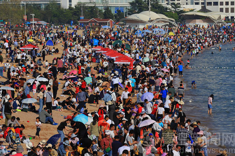 在五一假日里,青岛海滨各大浴场人气火爆。