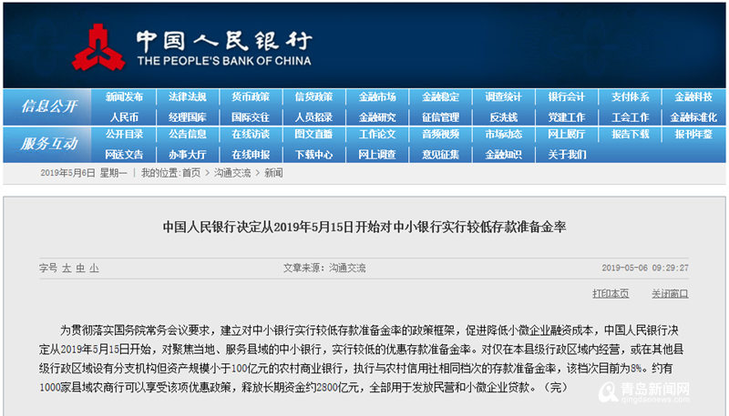 青岛新闻网5月6日讯(记者 刘倩倩)结构性降准要来了!记者从央行网站获悉,为贯彻落实国务院常务会议要求,建立对中小银行实行较低存款准备金率的政策框架,促进降低小微企业融资成本,中国人民银行决定从2019年5月15日开始,对聚焦当地、服务县域的中小银行,实行较低的优惠存款准备金率。对仅在本县级行政区域内经营,或在其他县级行政区域设有分支机构但资产规模小于100亿元的农村商业银行,执行与农村信用社相同档次的存款准备金率,该档次目前为8%。约有1000家县域农商行可以享受该项优惠政策,释放长期资金约2800亿元,全部用于发放民营和小微企业贷款。