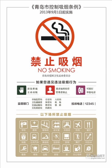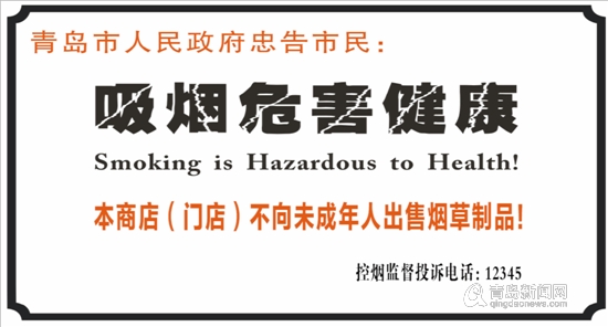 根据《青岛市控制吸烟条例》有关规定,青岛市爱卫办特制定《青岛市控烟标识制作标准与设置规范》,该规范自5月10日起施行,确定《青岛市控制吸烟条例》规定的各类禁止吸烟场所和烟草销售场所将更换全新的禁烟标识,截至2019年6月底前全部更换完毕。