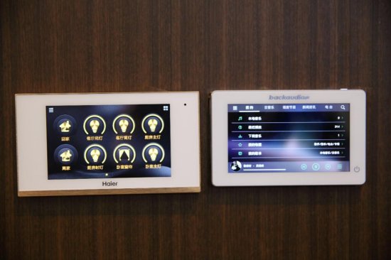 靠近门口的墙壁上,可以看到两块智能触控面板,这代表已经进入5大物理空间中智慧客厅的范围。左侧面板可以操控全屋家电,点击回家模式,灯光、窗帘、空调、电视自动开启;点击离家模式,这些会自动关闭,两种场景均能实现自定义。右侧面板是娱乐面板,可以选择音乐。