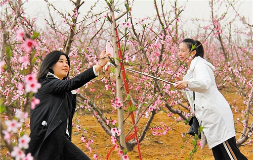桃花节期间,游客在桃花林里赏花拍照。 (徐亚晓 摄)