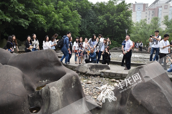 在校园参观环节,世外桃源般的校园风景让记者们流连忘返,其中,占地100亩的大江风骨景观,让记者们眼前一亮,大大小小的长江石形态各异,错落有致,甚至石头上被江水冲击的痕迹,和当年纤绳留下的凹痕,还清晰可见。