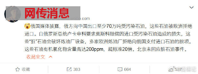俄出口欧洲石油因污染被拒中国“接盘”?别被网传消息轻易带动情绪!