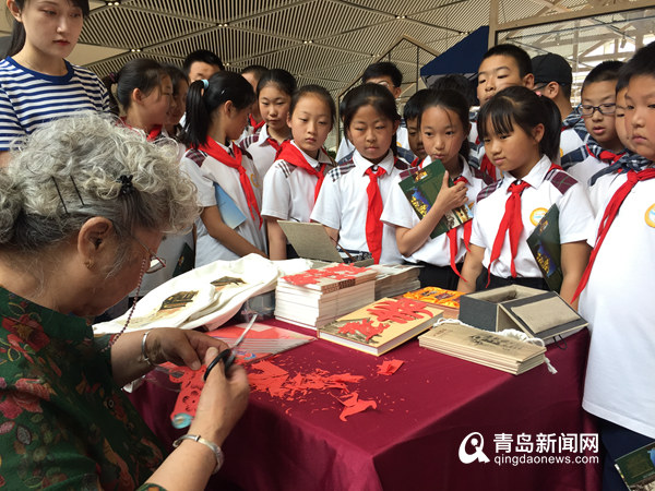 活动后,少先队员们观摩传统手工艺剪纸。