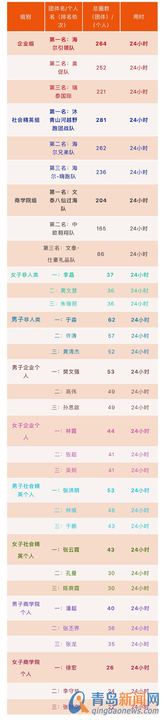 此次赛事的主要战场在团队马拉松接力赛,今年的团队赛共有近百支企业队伍参赛。每支队伍由6位跑步者/走路者组成,在24小时内,在3km指定赛道上完成接力赛。值得一提的是,“帆船之都”先锋团队、青岛奥帆城市发展促进会团队、青岛媒体跑团首次参加24小时精英挑战赛。