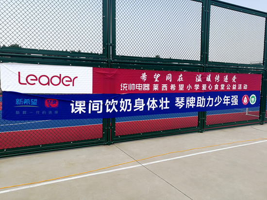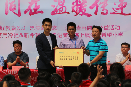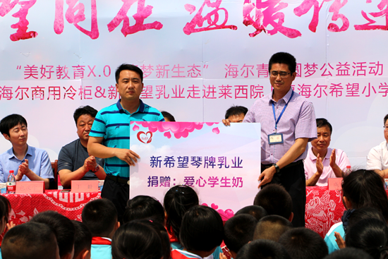活动现场举行了爱心食堂揭牌仪式,新希望琴牌乳业携手海尔商用冷柜、统帅电器,让爱心食堂落户在莱西院上镇海尔希望小学。