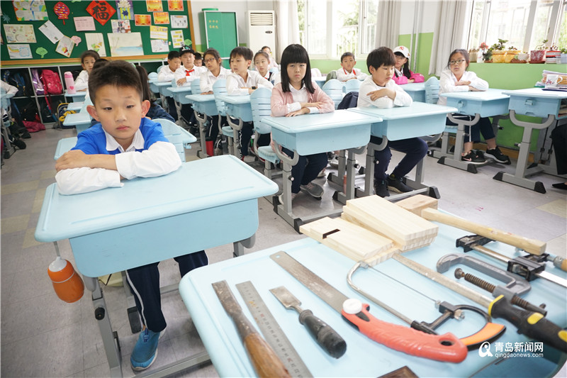 手工教室里来自鲁班工坊的滕剑晖老师正手把手的交给学生制作尺子书签、手机支架,木作项目需要制作人付出体力和脑力,画图、切割、打磨,可以让浮躁的心沉静下来,体会慢工出细活的意义,在实践中体会“工匠精神”。