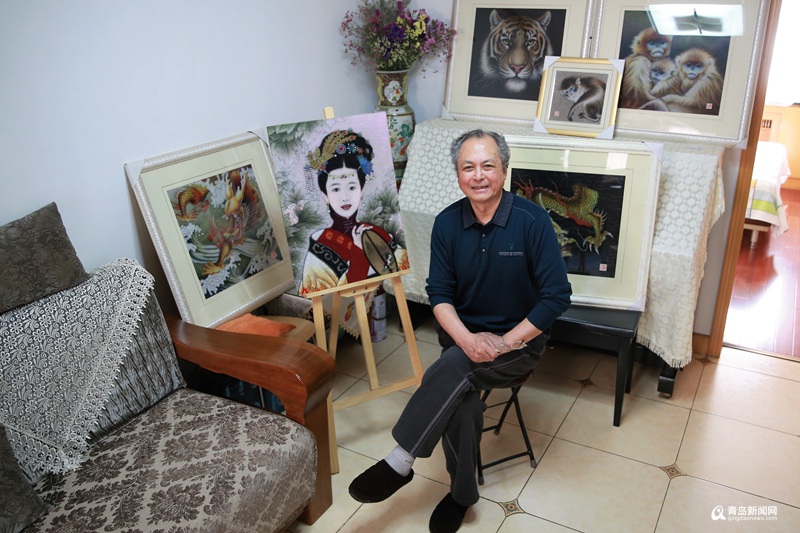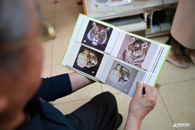 怒吼狮,意境桥,仕女把扇摇。在刘学山手下,动物、风景、人物个个生动传神。为调好一种颜色,他把四五个色的毛线层层叠加;为让作品更精致,他完成后摆在显眼位置,得空就站远处看,发现瑕疵立刻补。