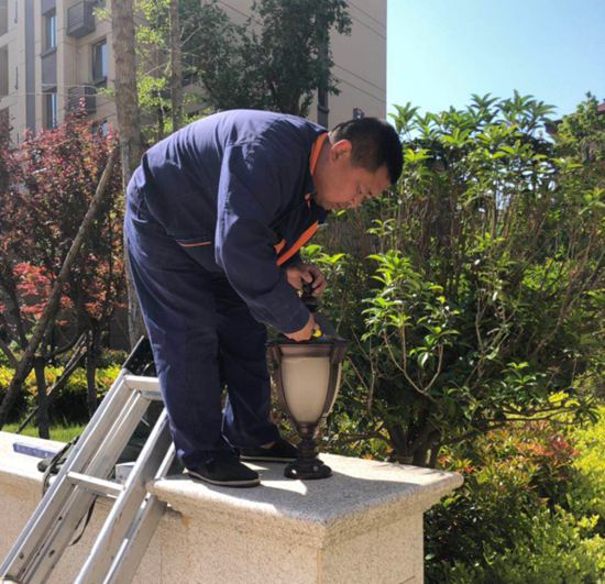 攀高爬低是工程人员的日常,维修园区灯,对小区的设施设备进行维修养护,保证小区设施设备正常运行;对小区的下水管道进行疏通,保证小区下水畅通、无堵塞;定期检查电梯及其他设备运行状况,保证小区业主出行安全。