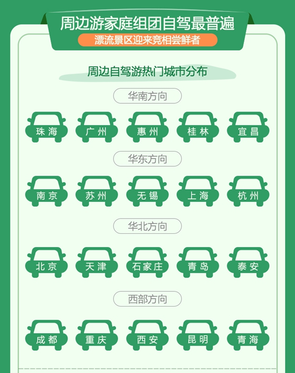 虽然端午小长假高速公路并不免费,但是,自由、随性的自驾游依然较受游客青睐,家庭组团自驾游最为常见,由此带动周边游热门目的地人气攀升。具体而言,华南方向的珠海、广州、惠州、桂林、宜昌,华东方向的南京、苏州、无锡、上海、杭州,华北方向的北京、天津、青岛、石家庄、泰安,西部方向的成都、重庆、西安、昆明、青海等城市受到较多周边短途自驾游客的青睐。