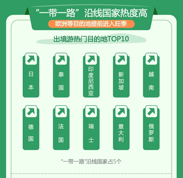 出境游方向,日本、泰国、印度尼西亚、新加坡、越南、德国、法国、瑞士、意大利、俄罗斯成为此次端午小长假前十名热门目的地,其中,“一带一路”沿线国家有5个。在新加坡和越南两个“一带一路”沿线国家,由于是端午节期间出游,游客还可体验独具当地风味的娘惹粽和黄姜糯米饭。