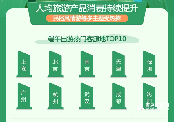 青岛新闻网6月10日讯(记者 王爽 通讯员 顾灵灵)途牛发布《2019端午小长假旅游消费盘点》,对今年端午旅游市场消费情况做出系统分析。上海、北京、南京、天津、深圳、广州、杭州、武汉、成都、沈阳消费者出游热情最高,上榜端午出游客源地前十强。从游客消费情况看,2019年端午小长假全国游客人均旅游产品花费相比2018年增长13%。与往年相比,今年端午节出游主题更为丰富,民俗风情游、避暑游、孝心游、亲子游、家庭游、乐园游、登山游等均人气火爆。