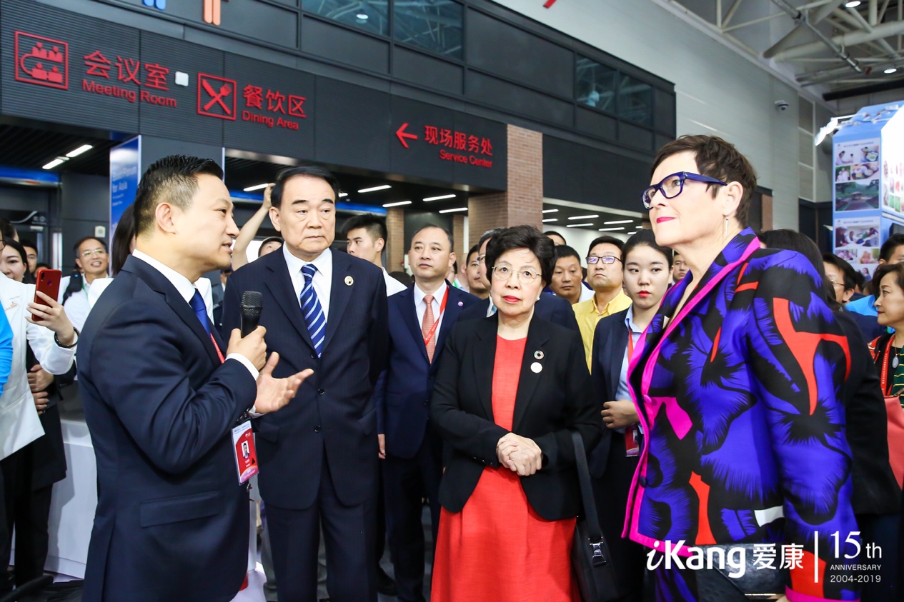 爱康集团创始人、董事长兼CEO张黎刚(左一)陪同领导参观并讲解了爱康通过旗下体检与医疗中心可以为广大客户提供的人工智能及精准医疗服务。博鳌亚洲论坛秘书长李保东(左二),博鳌亚洲论坛全球健康论坛大会主席陈冯富珍(右二),新西兰前总理Jenny Shipley(右一)