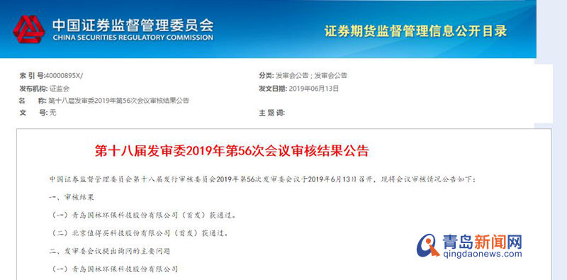 青岛新闻网6月14日讯(记者 刘倩倩)记者了解到,13日,青岛国林环保科技股份有限公司(以下简称“国林环保”)A股首发上市申请(IPO)顺利过会,成为2019年青岛辖区第二家过会企业。青岛也有望迎来第36家A股上市公司,第37家境内上市企业。至此,全市境内外上市企业家数达到49家,股票54只,稳居全省第一。