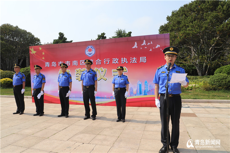 在换装仪式现场,200余名执法人员身着新式制服,英姿飒爽,精神振奋。仪式上,全体执法人员进行了集体宣誓,表示将忠于职守、依法行政、执法为民,为推进法治政府建设而努力奋斗。执法人员代表和协勤人员代表分别进行了表态发言。市南区综合行政执法局党组书记、局长肖辉在仪式上说,此次换装工作是坚持依法行政、加强队伍正规化建设的需要,是新时期综合行政执法工作的内在要求,希望以此次换装为契机,全局不断实现依法行政新突破、树立执法队伍新形象、开创执法工作新局面。