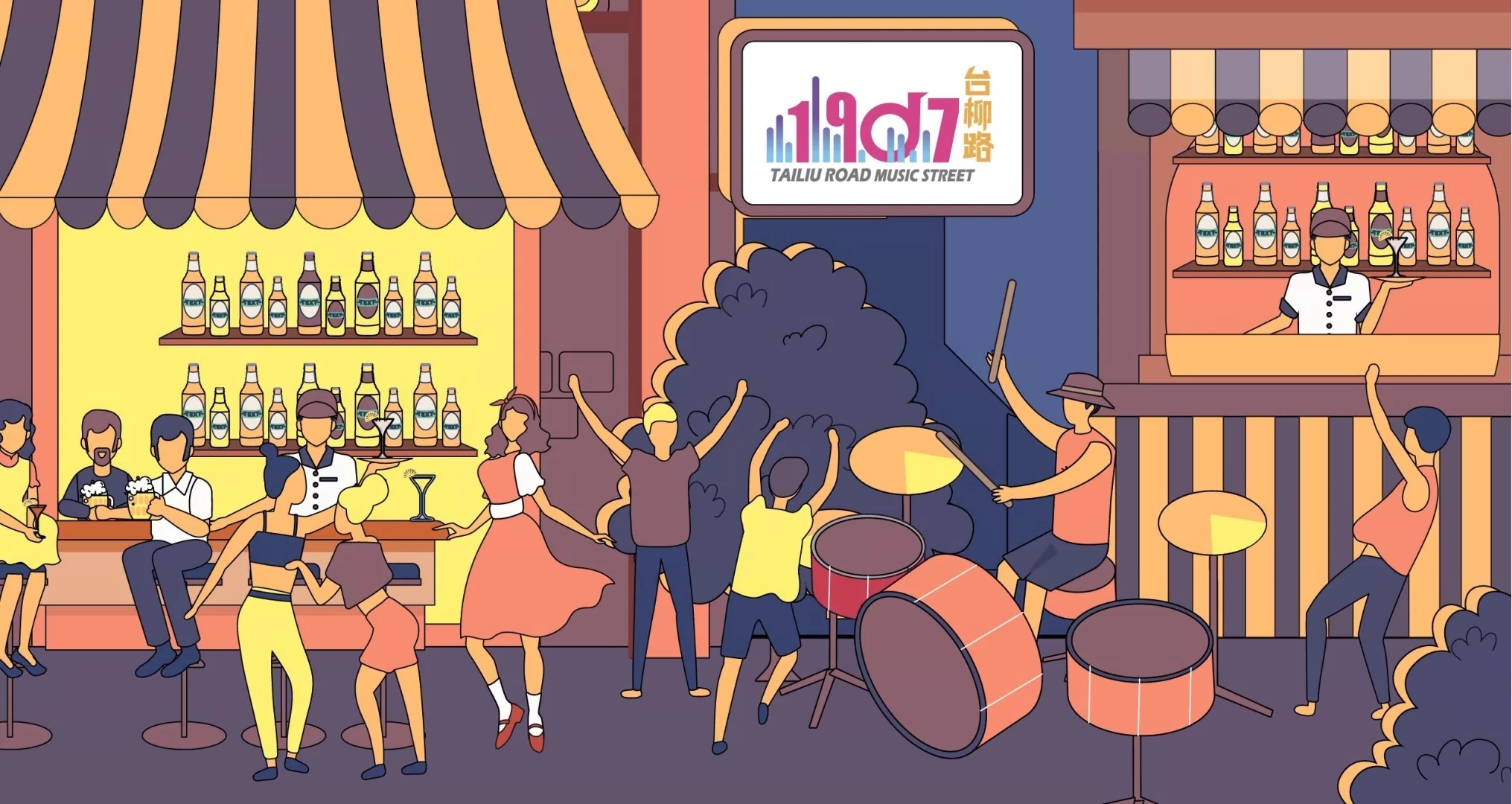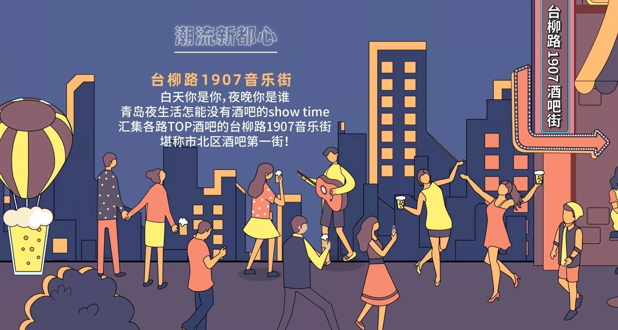 漫画形式从青岛本土的夜生活入手,让青岛的白天和夜晚两个方面进行对比,从贴近群众、生活化的角度去打动老百姓,宣传形式更接地气儿,更容易让群众接受。归根结底,台柳路1907音乐街区的打造在彰显青岛城市气质与特色的同时,更是为了丰富人民群众的夜生活,使之成为一个内容健康、服务规范、绿色安全,大众消费更日常化的时尚潮流消费地。