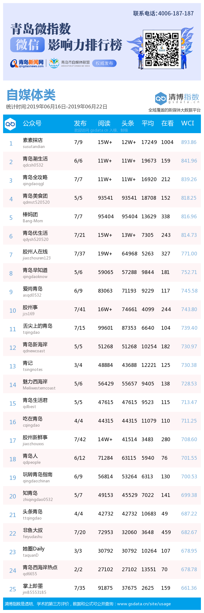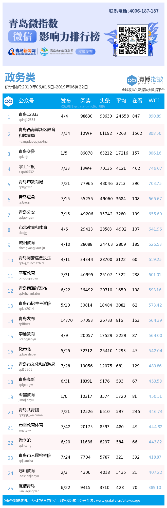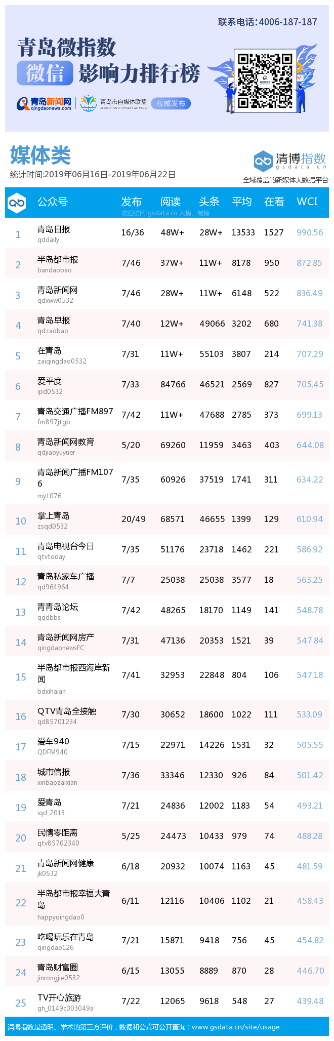 青岛新闻网6月24日讯(记者 邢书玲)由青岛新闻网、清博指数平台联手打造的“青岛微指数微信影响力排行榜”今日发布一周(6月16日-6月22日)榜单。