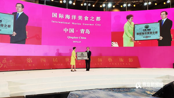 闭幕式上,世界中餐业联合会会长杨柳代表世界中餐业联合会向青岛授予了“国际海洋美食之都”的称号。