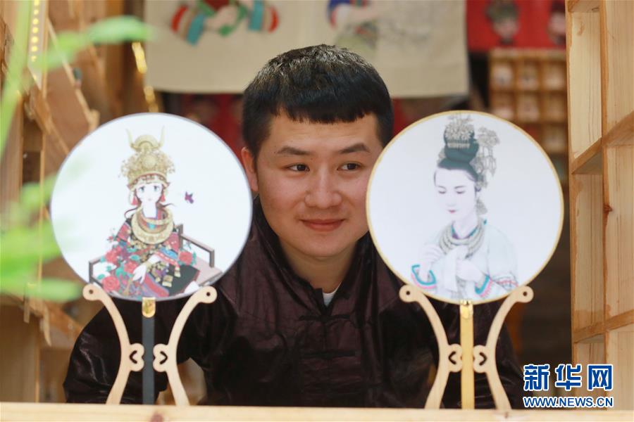 2019年4月16日,在贵州黎平,兰才生在插画馆内查看根据自己插画作品制作的扇面。“90后”侗族青年兰才生2015年大学毕业后回到家乡贵州黎平,在肇兴侗寨内创立“兰才生插画馆”,以苗族侗族的少数民族文化为主题创作插画,开发衍生文创产品。画风细腻的艺术插画在当地小有名气,受到海内外游客的肯定。“以插画的形式,让贵州的少数民族文化被更多人喜欢和了解是我最大的心愿。”兰才生说。青年兴则国家兴,青年强则国家强。在我国广袤的土地上,激扬着热情与活力的青年们正以蓬勃向上之力,在平凡的岗位中挥洒着汗水,在自我奉献中展现人生价值。新华社记者 欧东衢 摄