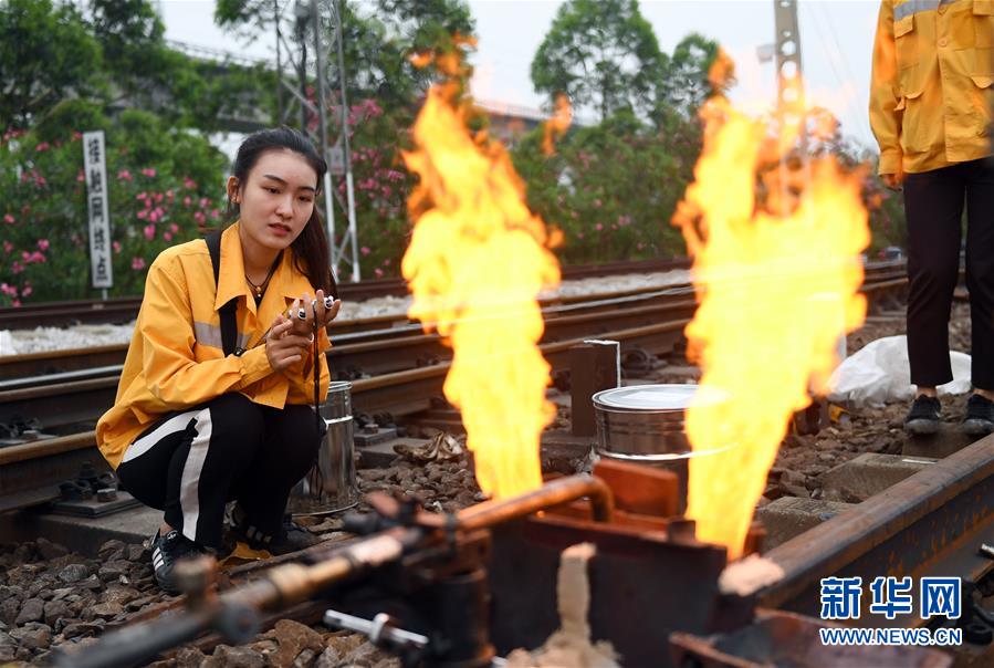 2017年4月26日,在广西南宁市江南区湘桂线金鸡村站附近,桂儒彬在换轨施工现场作业。1993年出生的桂儒彬是南宁铁路局柳州工务机械段换轨大修车间焊轨一班焊轨车三号位操作手,车间中仅有的8位女职工之一。她和同事们负责着南宁铁路局数千公里铁路线的老损钢轨和道岔更换、焊轨等任务。青年兴则国家兴,青年强则国家强。在我国广袤的土地上,激扬着热情与活力的青年们正以蓬勃向上之力,在平凡的岗位中挥洒着汗水,在自我奉献中展现人生价值。新华社记者 陆波岸 摄