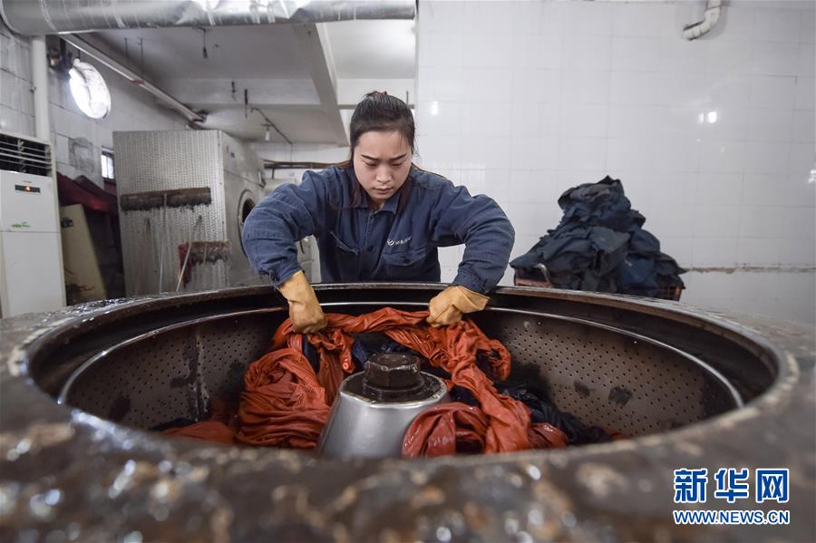 2016年1月26日,在位于安徽宿州的祁东煤矿洗衣房内,“90后”洗衣工张静将衣服放入脱水机里。张静2013年进入皖北煤电集团祁东煤矿从事洗衣工作。尽管工作辛苦,但张静始终坚守在后勤一线,用细心和贴心服务煤矿工人。青年兴则国家兴,青年强则国家强。在我国广袤的土地上,激扬着热情与活力的青年们正以蓬勃向上之力,在平凡的岗位中挥洒着汗水,在自我奉献中展现人生价值。新华社记者 张端 摄