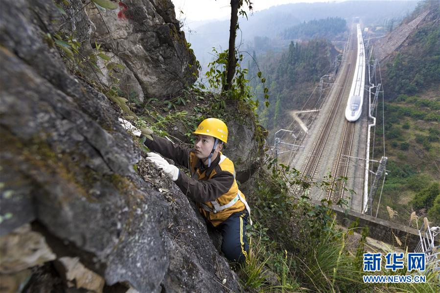 2017年1月19日,在湖北宜昌,武汉铁路局荆门桥工段“90后”桥隧工张艺在白树凹二号隧道上的危石观测点检查危石情况,下方是宜万铁路。当许多人已踏上回家团圆之路时,张艺日夜与大山为伴,坚守岗位,监测山上危石的情况,确保宜万铁路畅通。青年兴则国家兴,青年强则国家强。在我国广袤的土地上,激扬着热情与活力的青年们正以蓬勃向上之力,在平凡的岗位中挥洒着汗水,在自我奉献中展现人生价值。新华社记者 熊琦 摄