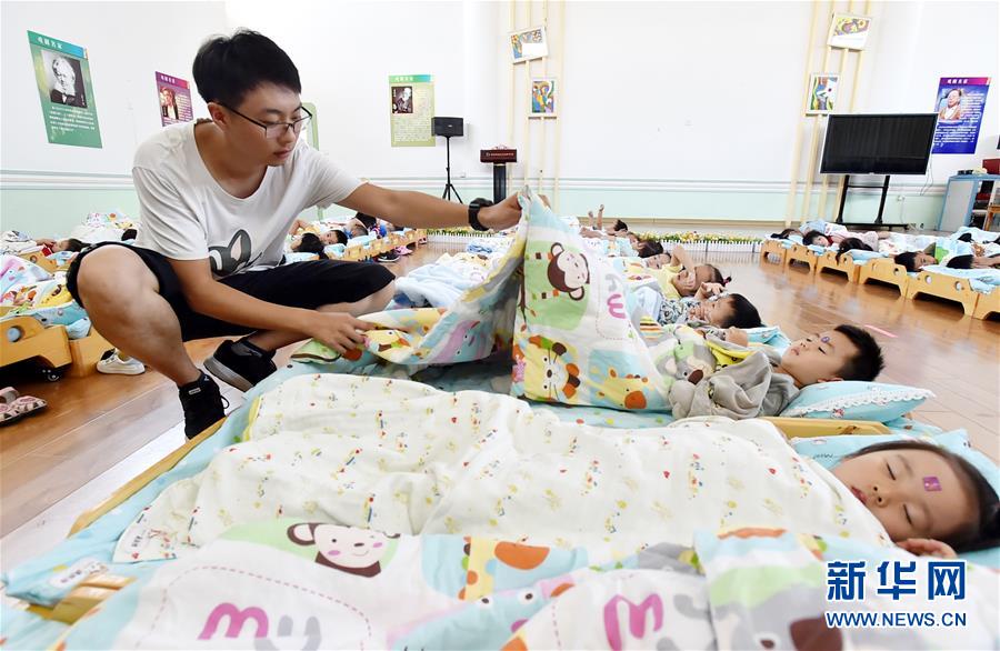 2018年9月4日,在江苏省扬州市机关三幼京华城幼儿园,“90后”教师陈叙良给小朋友盖被子。他认为,在培养3至6岁孩子的行为习惯方面,男幼师能够给孩子带来全新的感受;性别特征决定了男幼师在教学方式、与幼儿互动的风格上都与女幼师有很大不同,在教育观念、思维方式等方面能够和女幼师形成互补,更能体现出“阳刚教育”的特殊魅力。青年兴则国家兴,青年强则国家强。在我国广袤的土地上,激扬着热情与活力的青年们正以蓬勃向上之力,在平凡的岗位中挥洒着汗水,在自我奉献中展现人生价值。新华社发(庄文斌 摄)