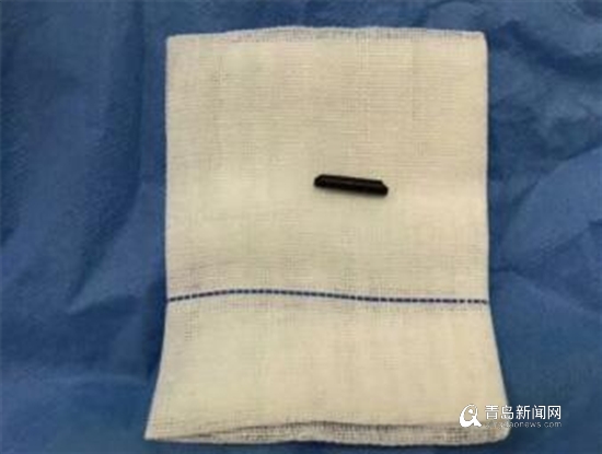 医生从男子手掌中取出折断的筷子,约2cm长。