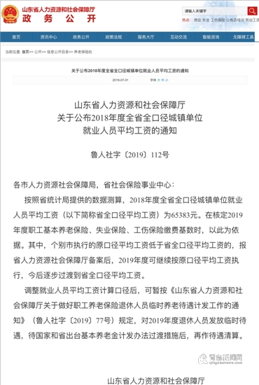 青岛新闻网7月2日讯 (记者张萍)昨日,山东省人社厅官网发布通知,按照省统计局提供的数据测算,2018年度全省全口径平均工资为65383元。