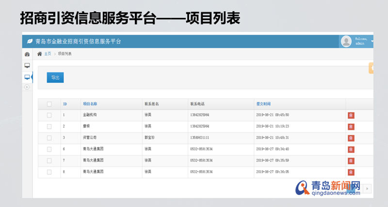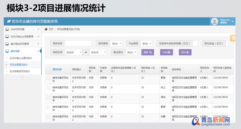 据了解,青岛市金融招商引资信息系统能够全面实时地对招商走访和储备项目进行监督管理,并做出相应的统计分析,是统筹推进全市金融招商引资的重要抓手。
