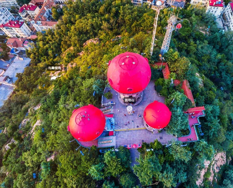更有山巅的3幢红色的蘑菇楼,宛如3柄火炬,屹立于满山青黛之中,十分夺目。