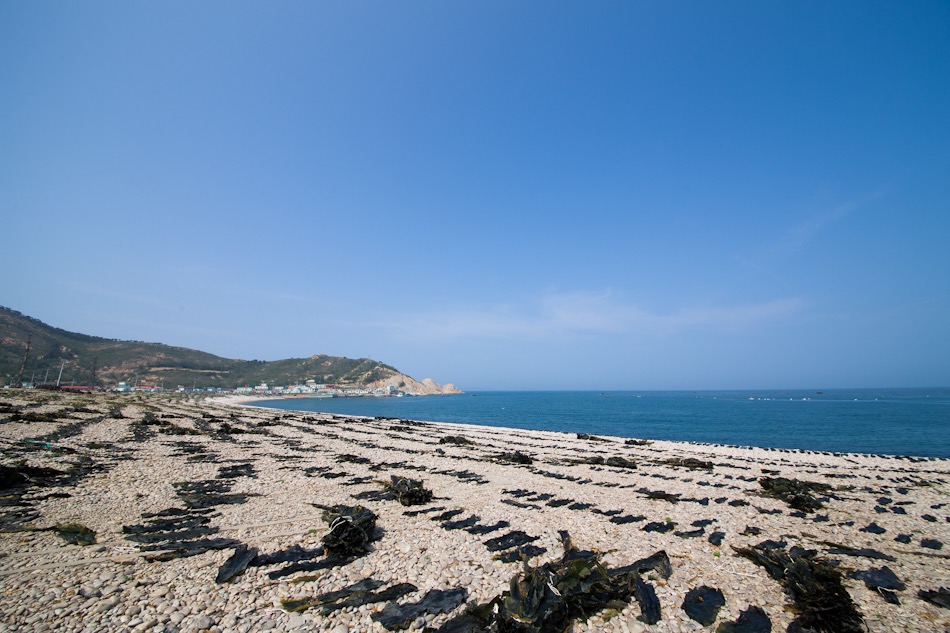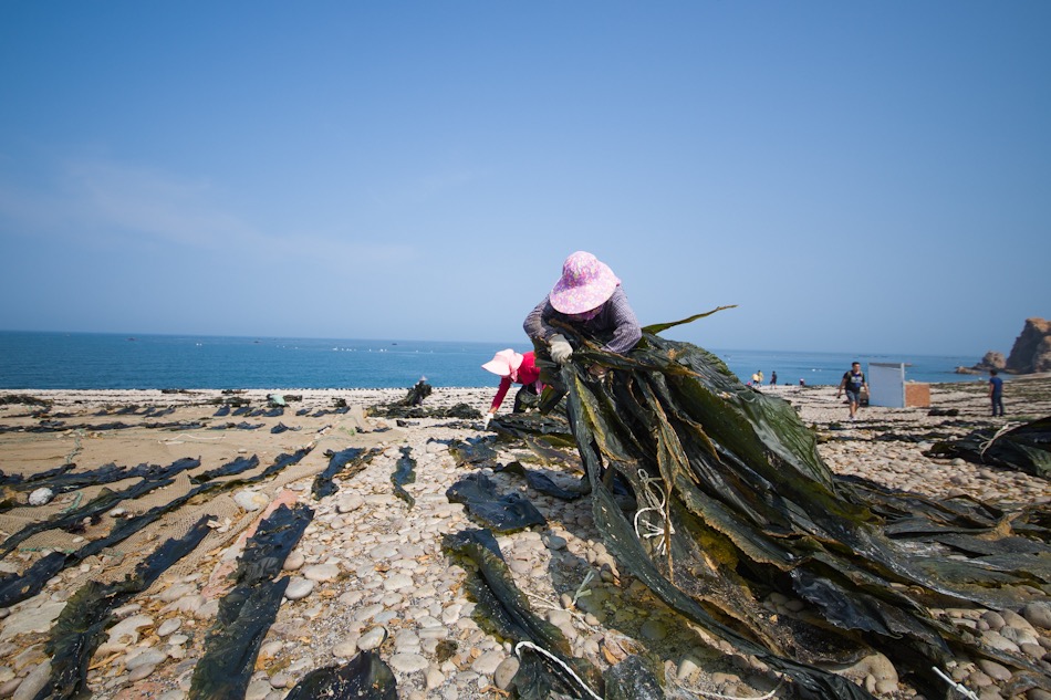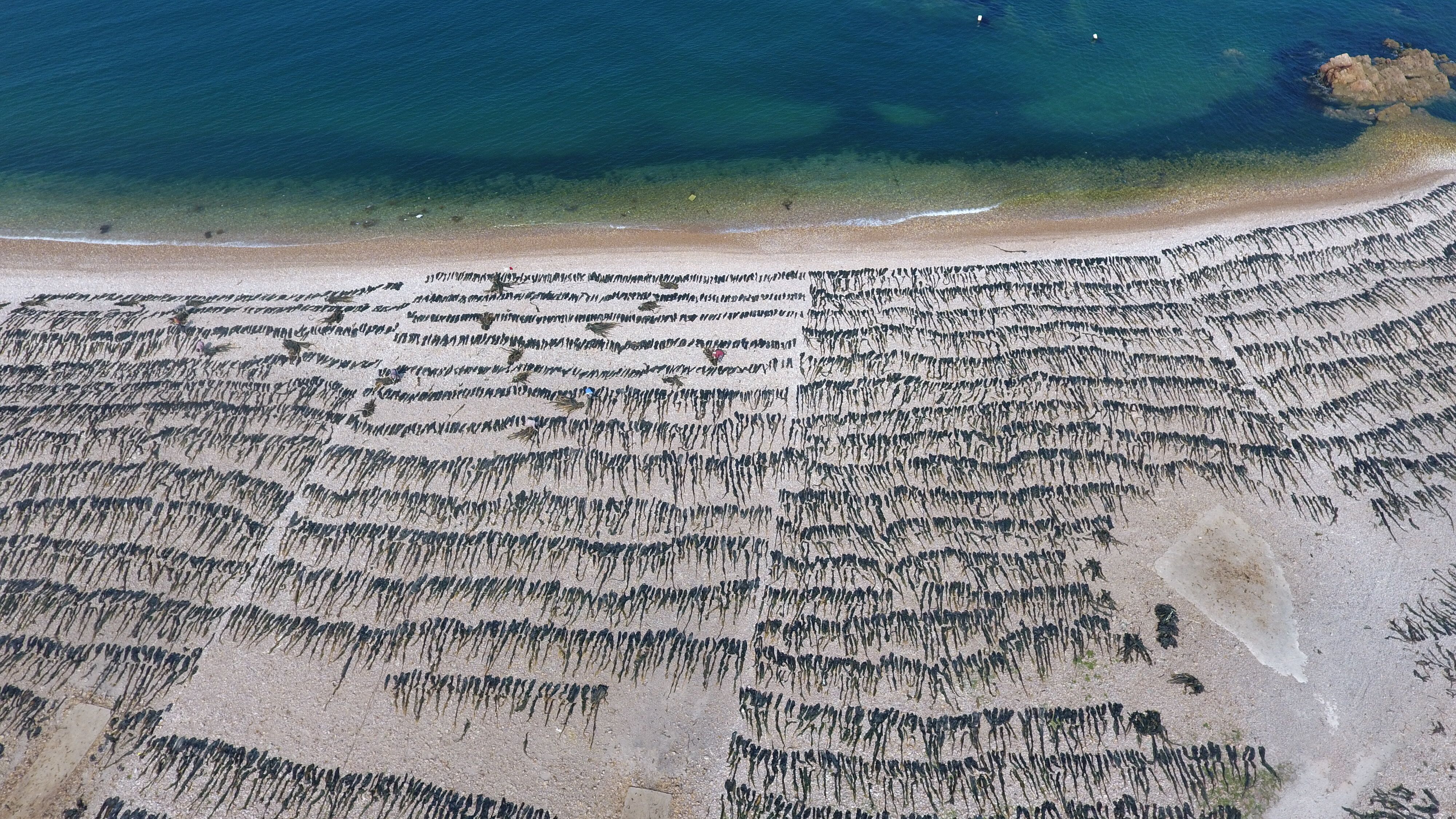 正在晾晒海带的渔民邓贞琪告诉记者,这里海流通畅,海水清澈,水质肥沃,因此养殖的海带宽厚且营养价值高。加之大钦岛海带多在鹅卵石上晾晒,与平坦沙滩相比,鹅卵石滩孔隙度更大,升温更快,空气流动性好,便于水分蒸发,更利于快速晾干,并且由于鹅卵石颗粒更大且表面光洁,晒干的海带没有沙子、泥土等杂质。