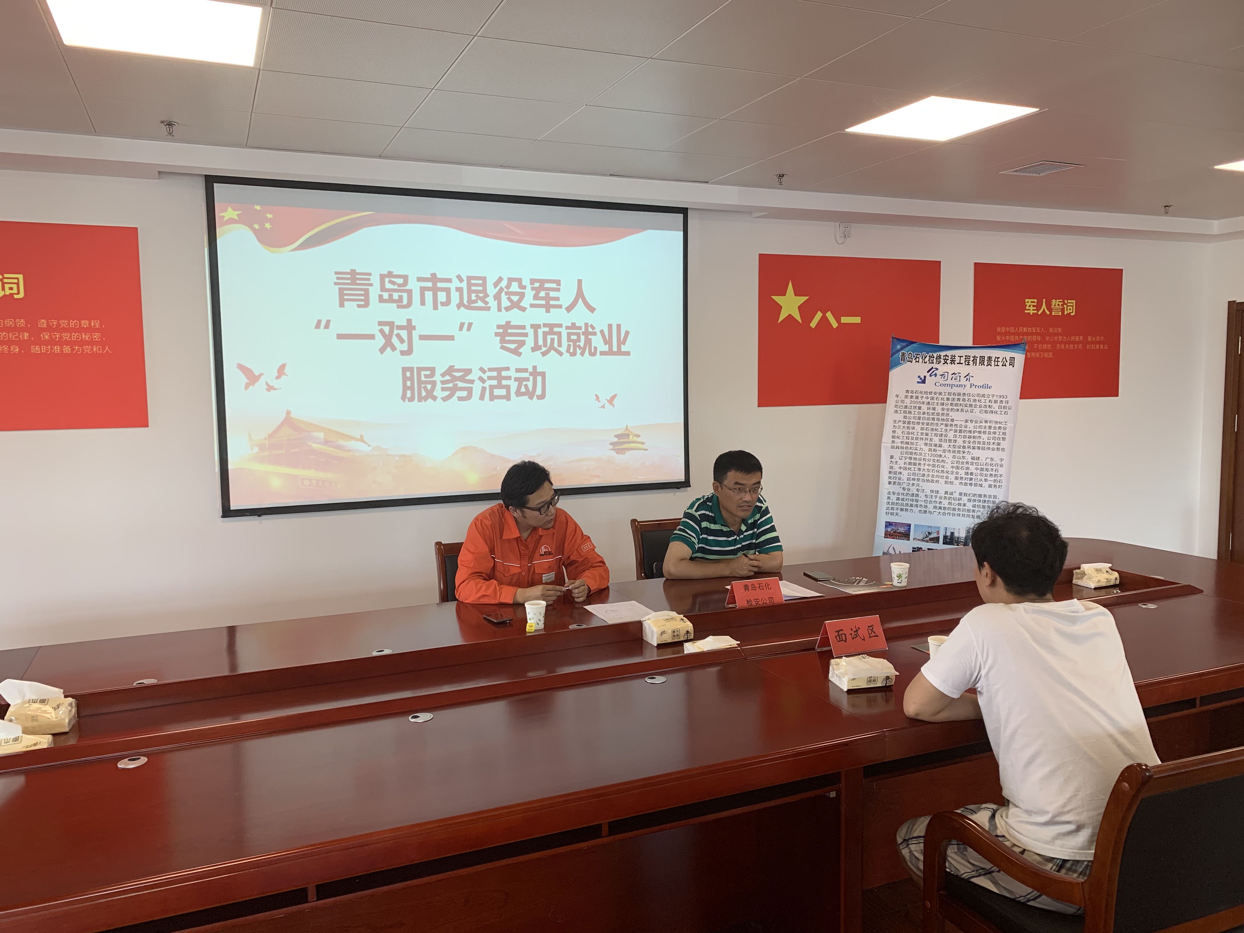 7月19日上午,青岛市退役军人服务中心举办第二场退役军人“一对一”专项就业服务活动,本次活动根据前期掌握的部分退役军人求职情况,组织青岛石化检修安装工程有限责任公司参加,提供工程师、维修电工、机修钳工、管铆工、焊工等就业岗位,自主就业退役士兵王豪、邹隆洋参加活动,2人均与该企业现场达成就业意向。