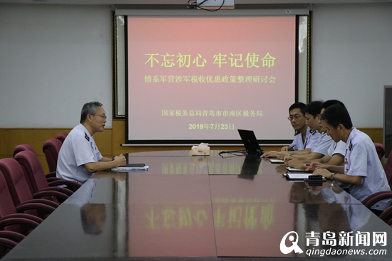 青岛新闻网7月24日讯(通讯员 王光东 刘洋)在“八一”建军节即将来临之际,为进一步发挥税收职能作用,推动青岛市全国双拥模范城建设,2019年7月23日上午,青岛市市南区税务局组织了“不忘初心牢记使命”情系军营涉军税收优惠政策整理研讨,该局军民融合工作服务站业务骨干参加了研讨。