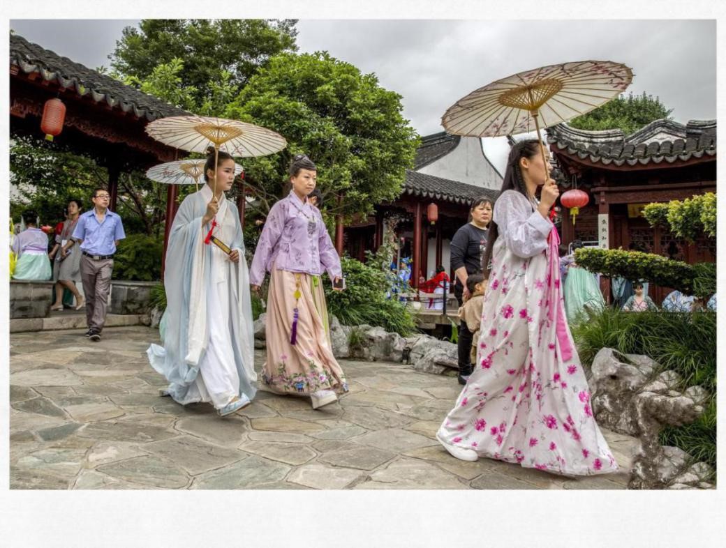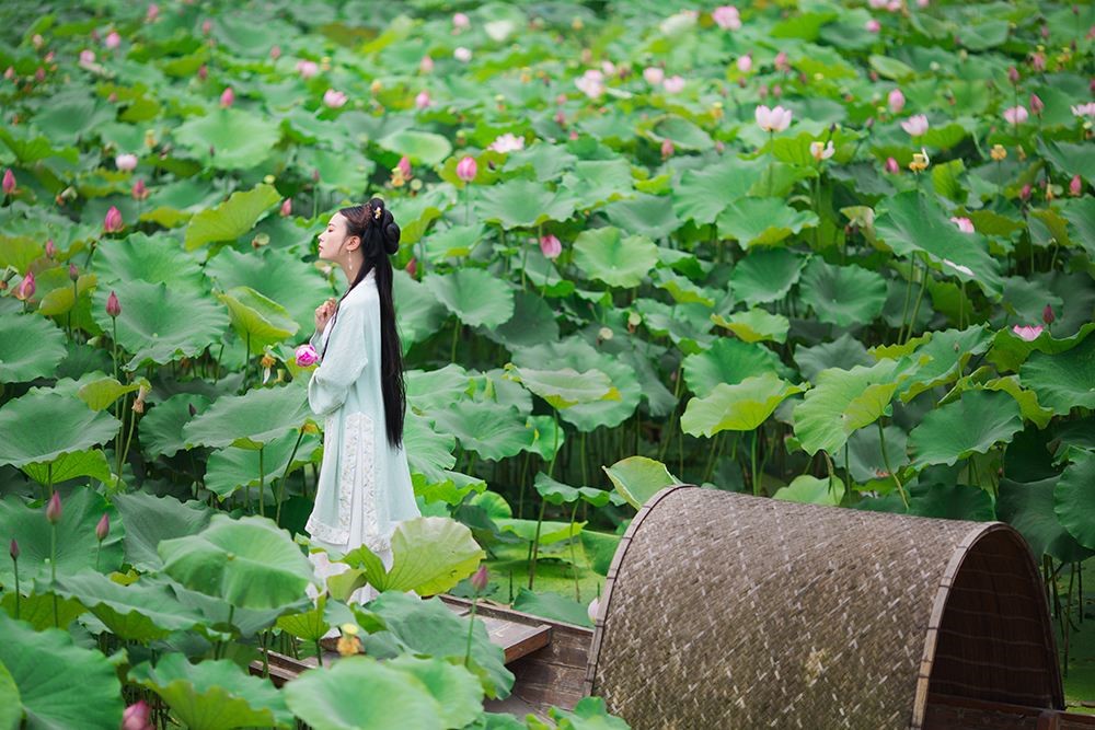 汉服好似盛开的荷花,虽不奢华却淡雅高洁。衣袖蹁跹、轻舟荡漾,泛舟游览二十里湿地景观水道,赏荷、采莲、戏鱼,欣赏优美湿地景观,让游客远离城市的喧嚣,来一场静心养神之旅。
