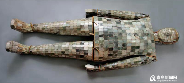玉衣,又称“玉匣”“玉柙”,是汉代皇帝和高级贵族所用殓服,全部用玉片制成,玉片之间分别以金丝、银丝、铜丝或其他丝织物,一般按照四孔连缀的方法编缀而成。从玉衣的形状观察,它的形制和编缀方法受到了铠甲,特别是战国时代铁制甲胄的影响。
