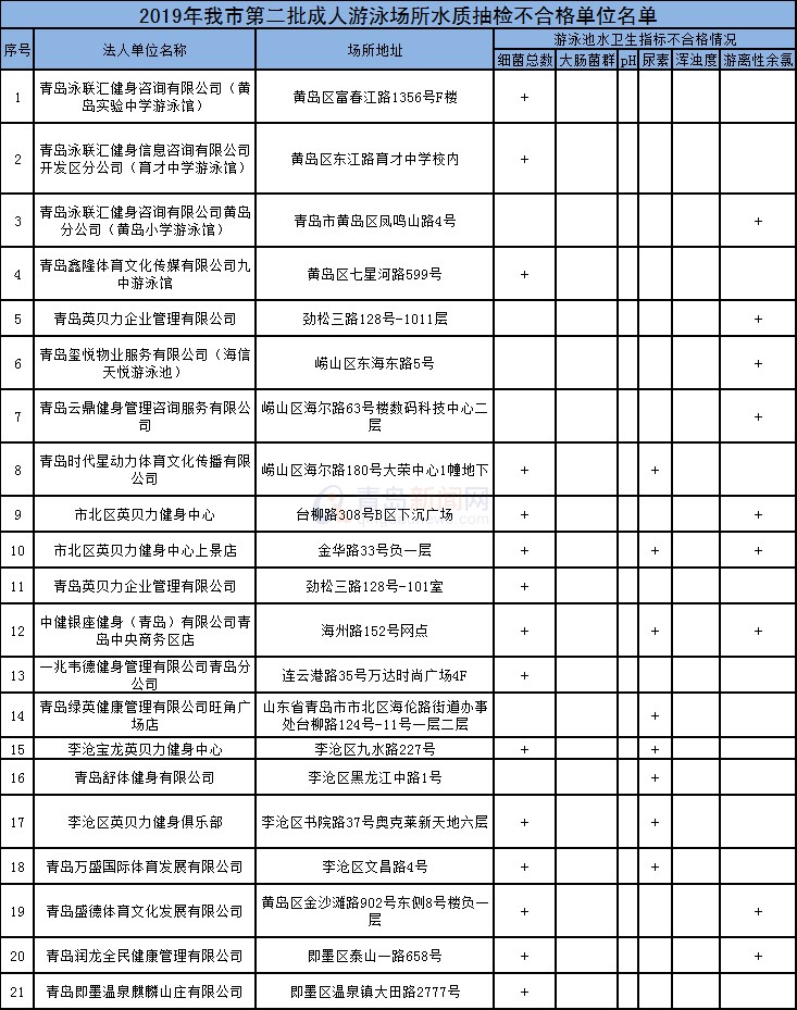 青岛新闻网7月29日讯 (记者 张萍)今天,青岛市卫生健康委监督执法局公布我市第二批成人游泳场所水质抽检结果,全市共抽检成人游泳场所103家,检测结果显示,其中有21家成人游泳场所的水质不符合国家卫生标准。市卫生健康委监督执法局公示了不合格场所名单,其中海信天悦游泳池、中健银座健身中央商务区店等上榜。
