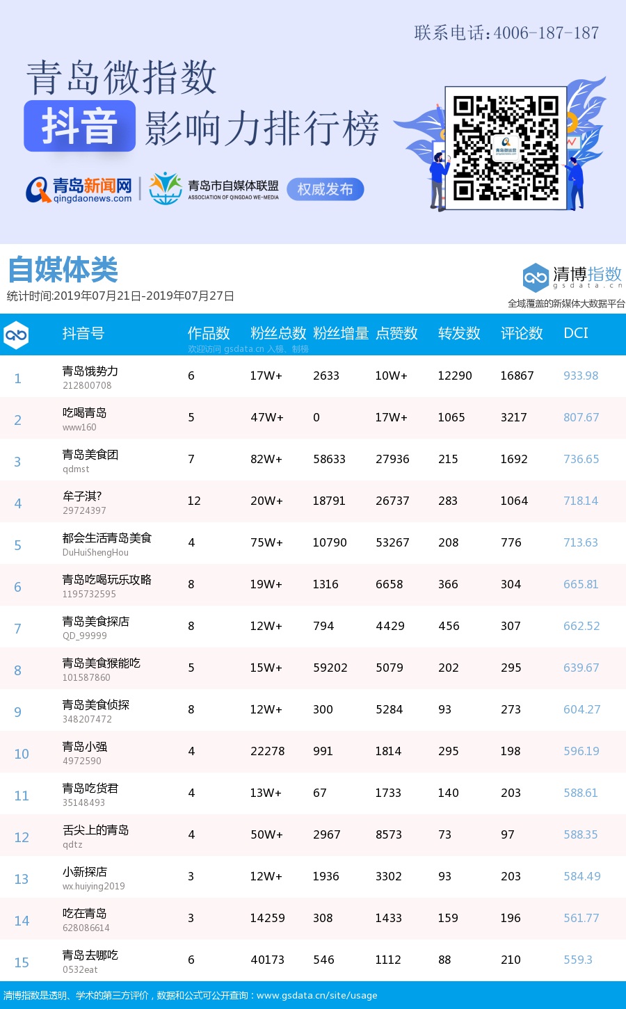 青岛新闻网7月29日讯(记者 邢书玲)由青岛新闻网、清博指数平台联手打造的“青岛微指数抖音影响力排行榜”今日发布一周(7月21日-7月27日)榜单。