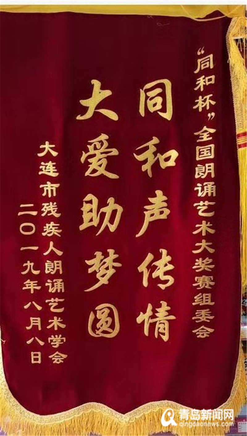 在全国朗诵爱好者中,有这样一个执着坚持的群体,他们在黑暗中寻找光明,他们眼睛看不到眼前的事物,但心里却装着华夏几千年来的经典诗文,他们克服障碍超越了自己,他们用心朗诵,用心做事,用一颗颗火热的心,点燃生命的激情!来自大连的刘振河老师就是其中的典型代表。刘振河是一位晋级复赛的盲人朗诵家,不仅出行不便,来回路费也成问题。大赛组委会了解情况后,李主席认为无论何种艺术形式,旨在追求真善美,我们应该以众志成城之心,圆参赛者的梦想。于是,李主席带头捐款并在平度市朗诵艺术家交流群里发起了众筹,不到一小时即募捐到2650元,着实令人感动!大赛组委会立即安排人员联系刘振河老师,把大家的一片爱心和温暖传递给他。得到资助的刘振河老师心怀感恩,对这份来自异乡的爱心倍感温暖,特地向“同和杯”全国朗诵艺术大奖赛组委会献上锦旗,以“同和声传情,大爱助梦圆”表达内心的感激之情,向爱心人士致敬致谢!他来信写道:作为一名参加比赛的选手,受到如此礼遇,感恩不尽!我一定把这一次青岛比赛盛情带回大连,让大家一起分享齐鲁大地的灿烂文化,人文情怀,朗诵盛况!