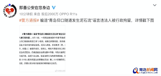 青岛新闻网8月12日讯(见习记者 丁淑华)今天,微博@即墨公安在您身边发布通报,编造"青岛仰口隧道发生泥石流“谣言违法人被拘留。
