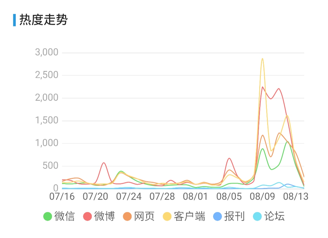 从热度走势图中,我们可以看到8月5日开始,关于“青岛台风”的信息呈现波动式上升,8月9日,“青岛台风”报道到达巅峰,其中客户端相关资讯信息热度波动最大,达到了2866的峰值,微博达到2248的峰值。8月11、12日分别达到两个次峰值,微博信息开始领先客户端,而当时正是台风从青岛登陆的时间。