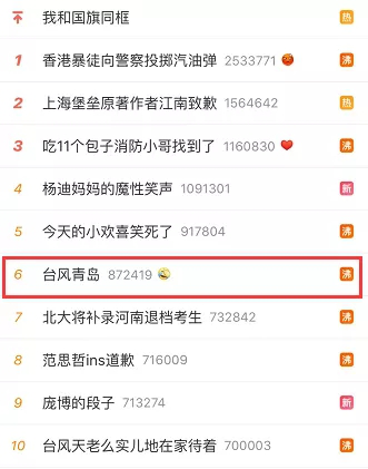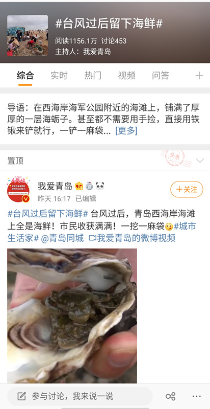 同时,在大家的共同努力下,“台风天致敬最可爱的人”、“台风过后留下海鲜”、“千难万难不离崂山”等微博超级话题阅读超千万。