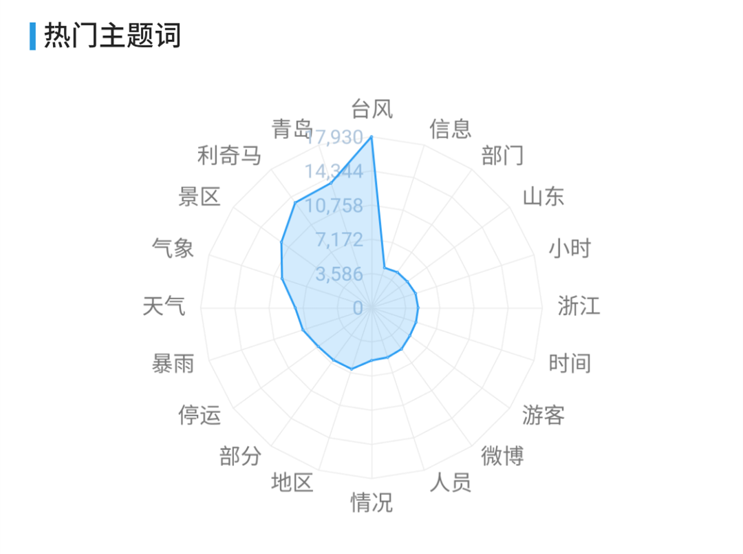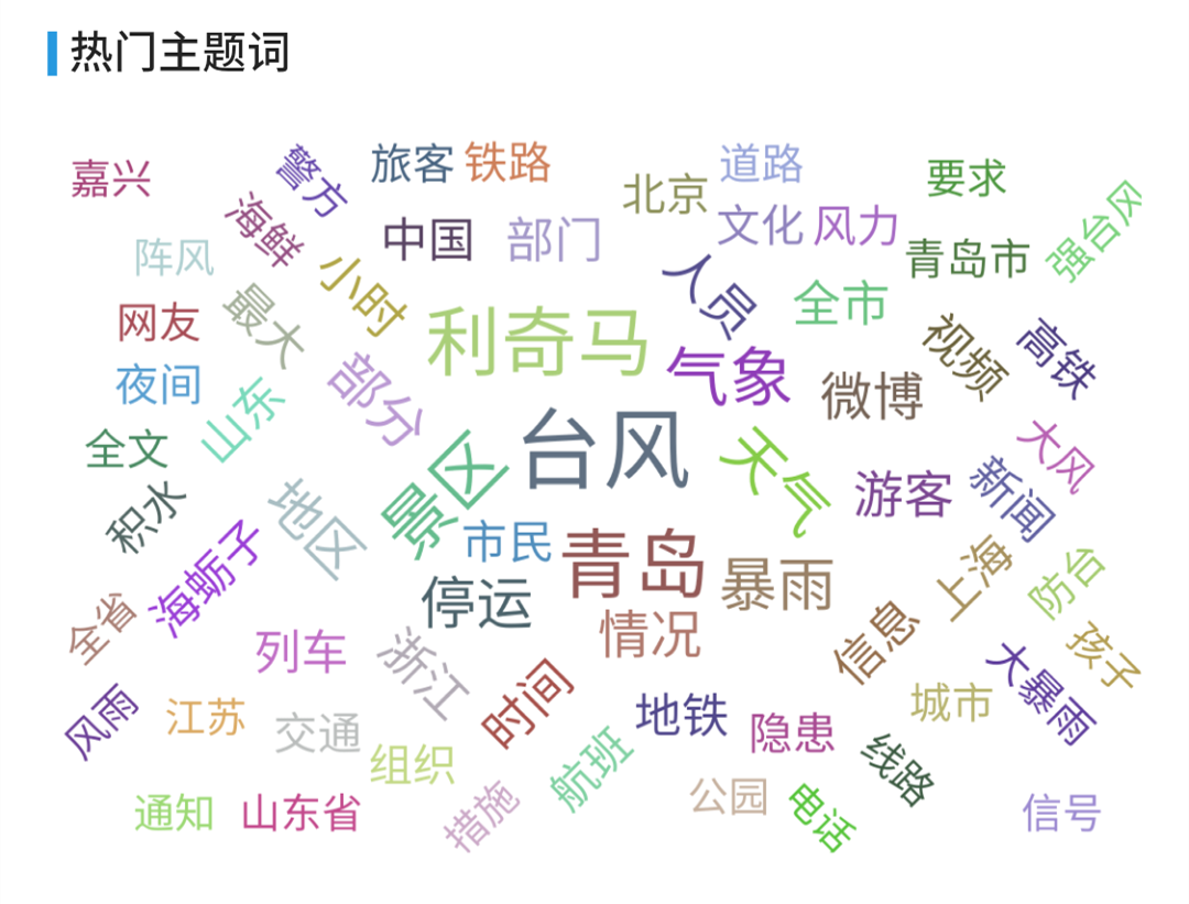 从热门关键词分布图中我们可以看到,在8月9日-8月12日之间,关于“台风”、“利奇马”、“青岛”、“景区”、“气象”、“暴雨”等关键词居高不下。