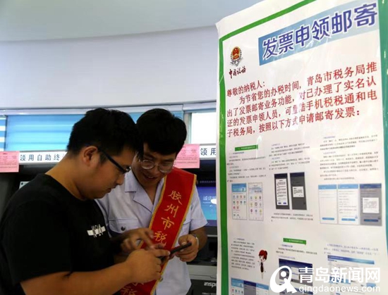 为让纳税人足不出户就能“办成税”“办好税”,今年8月份,青岛市积极推行发票网申邮寄配送业务,已办理实名认证的发票领购人,可登陆电子税务局和手机税税通APP申请邮寄发票,实现纳税人领用发票“多跑网路、不跑马路”的目标。青岛市税务局通过制作张贴申领发票二维码、发放明白纸、放置易拉宝等多种形式开展邮寄发票宣传推广工作,并由驻厅导税的青年突击队成员当起了网申邮寄发票的宣传员和演示员,帮助纳税人现场试办网上申领发票业务,让更多纳税人知晓这一方便快捷的领票途径,降低纳税人往返税务机关的办税成本。