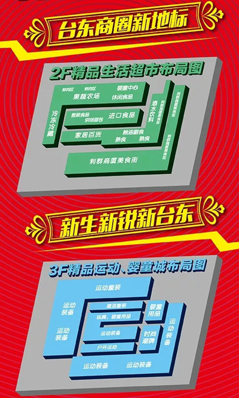 新店通过景观连廊与利群商厦相连,除版图面积的扩张,在超市布局、超市货品、消费体验等方面进行了全面的规划升级,精品生活超市以琳琅满目的进囗食品生鲜、全球各地的精品名酒、直达餐桌的新鲜果蔬为特色,引领台东商圈新风尚。