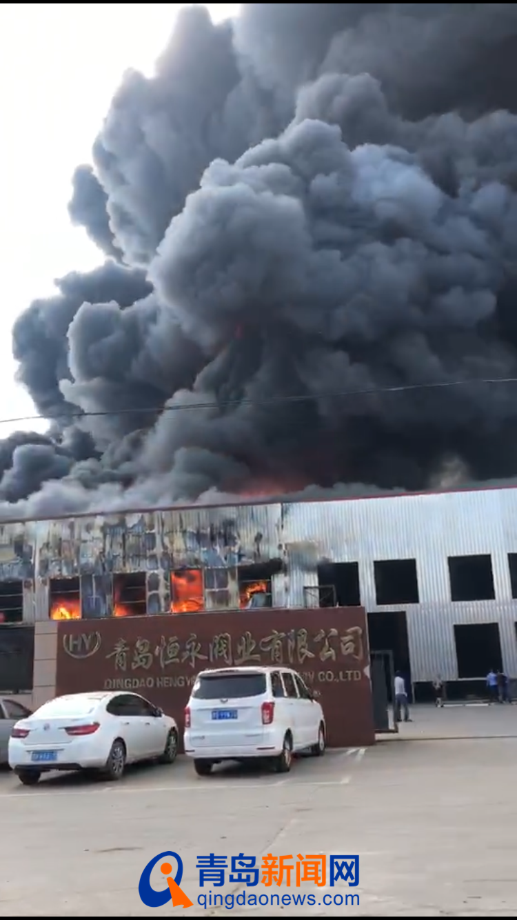 市民拍摄的现场视频显示,起火仓库位于青岛恒永阀业有限公司院内,来自天眼查的企业信息显示,该企业的经营范围为铸造、机械配件、不锈钢阀门及法兰加工制造、铆焊、木制品、木材、钢塑制品加工、货物进出口等。起火点距离流亭机场约20公里,有市民在飞机上拍到了火灾现场的滚滚浓烟。
