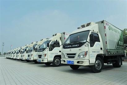 青岛万福集团肉类食品公司生产车间整装待发的冷链运输车。