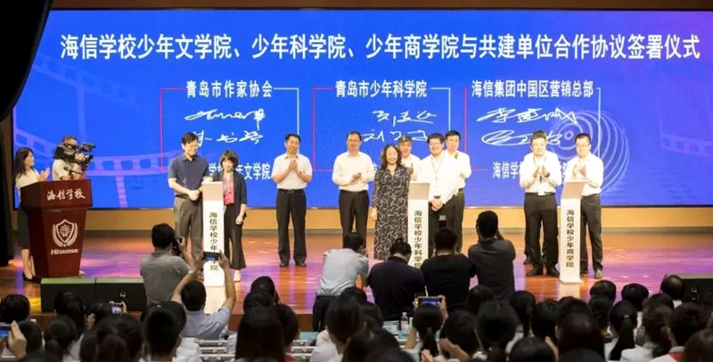 为了落实海信学校“人文底蕴深厚、科技意识鲜明、国际视野开阔”的办学理念,凸显人文、科技、国际三大特色,全力打造创新优质教育,学校借助海信集团优质资源和社会资源,揭牌仪式上宣布成立海信学校少年文学院、少年科学院、少年商学院,旨在为学生提供发现、尝试、发展、成长的平台,充分调动学生积极参与课程、参与活动、参与创造的积极性、主动性和创造性,更深刻地感知认识生活,让学生核心素养目标更好地落地,为海信学子全面、长期、个性发展搭建广阔平台。