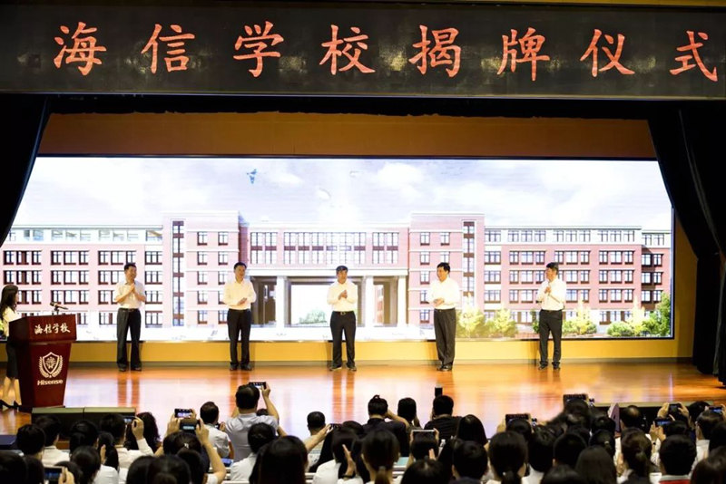 揭牌仪式上,青岛市副市长朱培吉,青岛市教育局党组书记、局长刘鹏照,青岛市市南区常务副区长张伟,海信集团党委书记、董事长、海信学校理事长周厚健及海信学校总督学马林共同为海信学校揭牌并致辞。