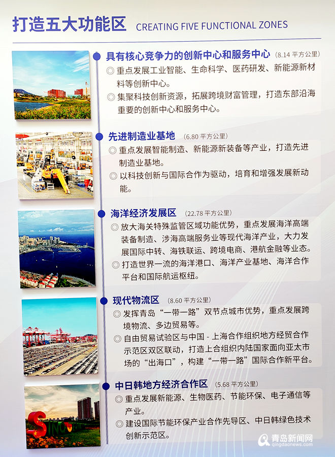 国务院批复的山东自贸试验区《总体方案》中,明确规定“青岛片区重点发展现代海洋、国际贸易、航运物流、现代金融、先进制造等产业,打造东北亚国际航运枢纽、东部沿海重要的创新中心、海洋经济发展示范区,助力青岛打造我国沿海重要中心城市”。青岛片区面积52平方公里,约占山东自贸试验区的43.3%,在三个片区中面积最大;承担106项改革创新试点任务,占全部试点任务的94.6%,承担的试点任务最多,这充分体现了党中央国务院和省委省政府对青岛关心关怀。青岛将借助此次自贸区批复的契机,叠加青岛西海岸新区、中国—上海合作组织地方经贸合作示范区、保税区、青岛经济技术开发区、青岛国际经济合作区等多个经济功能区优势,努力把青岛片区建设成青岛深化改革和扩大开放的试验区、打造“一带一路”国际合作新平台的引领区、推进高质量发展的先行区、建设现代化国际大都市的示范区。